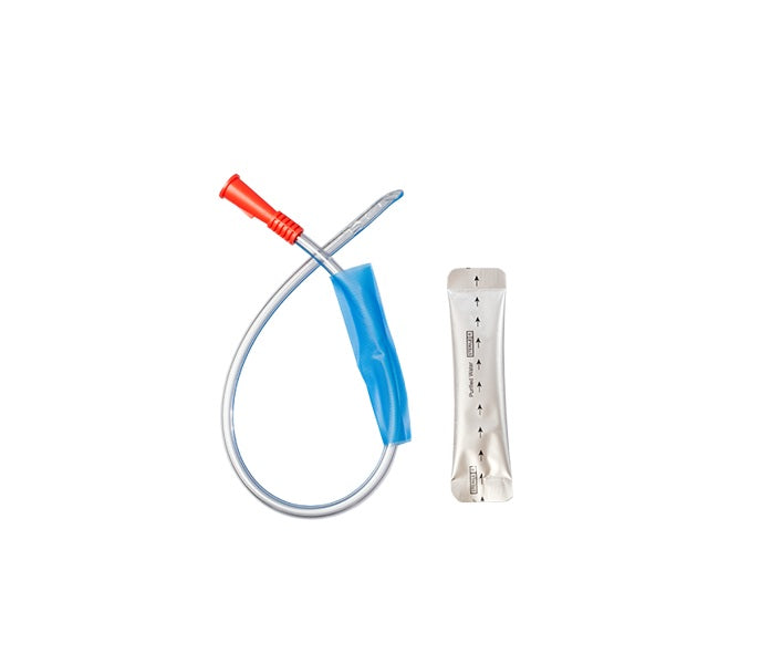 Enjoy the comfort and convenience of the MDevices Hydrophilic Nelaton Catheter with Water Sachet - Coude Tip, with its angled tip, specifically designed to support difficult insertions in men.